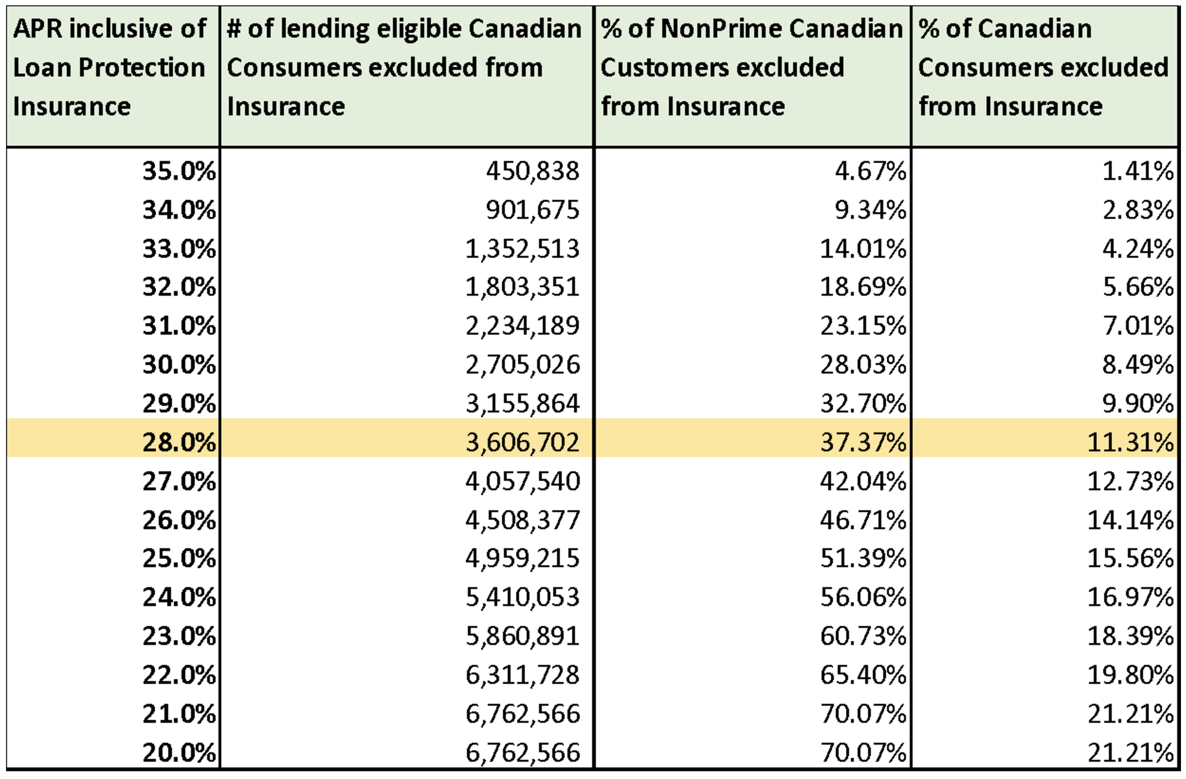 A potential change to the APR calculation for the maximum allowable 35.00% rate to be inclusive of the cost of insurance – specifically loan protection insurance – would negatively impact 3.5M people, which accounts for over 37% of Non-Prime Canadian Customers. This is in addition to the approximately 5.4 M Canadians who will already lose access to credit on January 1, 2025, due to the reduction of the maximum allowable rate of interest to 35%. Â