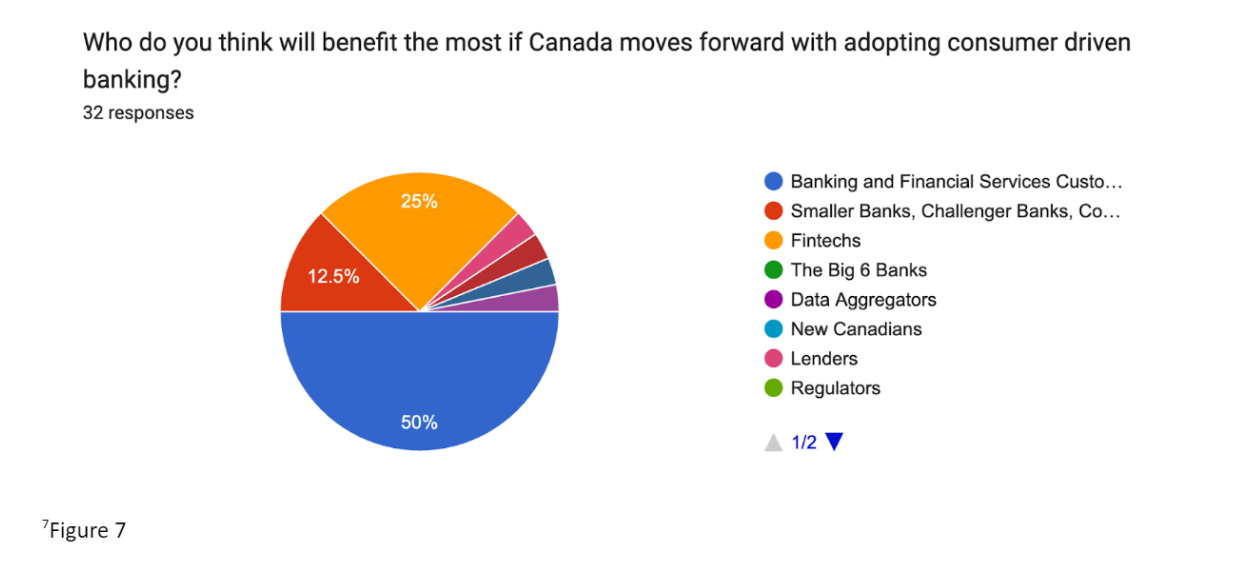 Figure 7: Who do you think will benefit the most if Canada moves forward with adopting consumer driven banking?  Data from a survey conducted by the Canadian Lenders Association. February, 2024.